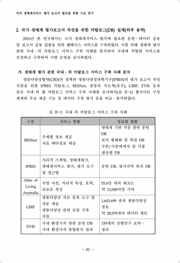 국가 생태계서비스 평가 보고서 발간을 위한 기초 연구 82 2. 국가 생태계 평가보고서 작성을 위한 카탈로그 DB 설계 외부 용역 2016년 본 연구에서는 국가 생태계서비스 평가에 필요한 문헌?데이터 공유 및 보고서 공동 집필을 위한 웹베이스 서비스를 구축하였다. 이를 위해 생태계 평가 관련 국내?외 카탈로그 서비스 구축 사례를 분석하여 국내에 적합한 서비스를 선정하고 구축하여 시범 운영을 실시하였다. 가. 생태계 평가 관련 국내?외 카탈로그 서비스 구축 사례 분석 생물다양성협약 CBD 의 정책과 생물다양성과학기구 IPBES 의 평가 보고서 작성 지원을 위한 IPBES 카탈로그, BESNet, 생명의 지도책 호주 , GBIF, EVIS 등과 같은 국내 외 웹 카탈로그 서비스 구축 사례를 조사하여 표 Ⅳ 1 ...