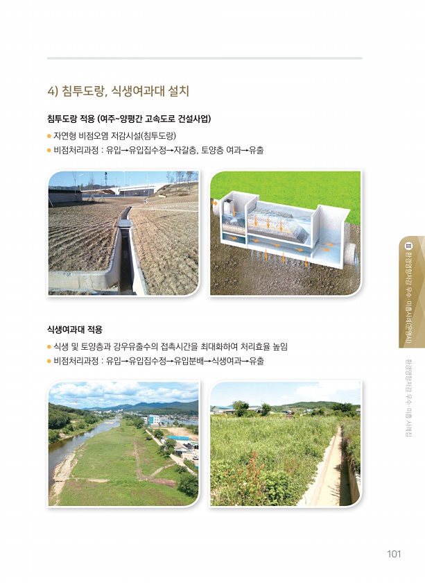 환경영향저감 우수·미흡 사례집 환경영향저감 우수·미흡사례 운영시 Ⅲ 101 4 침투도랑, 식생여과대 설치 침투도랑 적용 여주양평간 고속도로 건설사업 식생여과대 적용 ● 자연형 비점오염 저감시설 침투도랑 ● 비점처리과정 유입→유입집수정→자갈층, 토양층 여과→유출 ● 식생 및 토양층과 강우유출수의 접촉시간을 최대화하여 처리효율 높임 ● 비점처리과정 유입→유입집수정→유입분배→식생여과→유출
