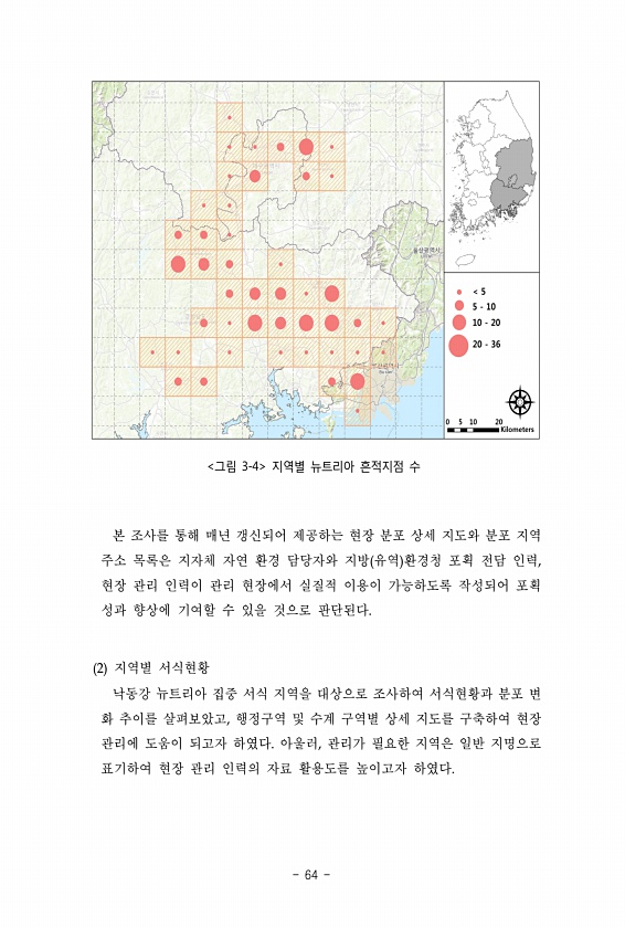 ?? ? ? ? 본 조사를 통해 매년 갱신되어 제공하는 현장 분포 상세 지도와 분포 지역 주소 목록은 지자체 자연 환경 담당자와 지방 유역 환경청 포획 전담 인력, 현장 관리 인력이 관리 현장에서 실질적 이용이 가능하도록 작성되어 포획 성과 향상에 기여할 수 있을 것으로 판단된다. 2 지역별 서식현황 낙동강 뉴트리아 집중 서식 지역을 대상으로 조사하여 서식현황과 분포 변 화 추이를 살펴보았고, 행정구역 및 수계 구역별 상세 지도를 구축하여 현장 관리에 도움이 되고자 하였다. 아울러, 관리가 필요한 지역은 일반 지명으로 표기하여 현장 관리 인력의 자료 활용도를 높이고자하였다.