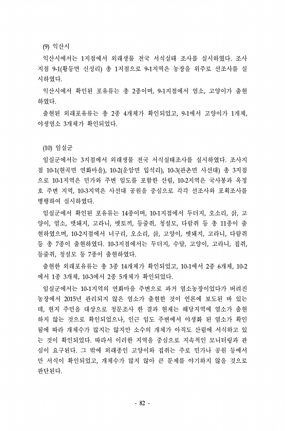 82 9 익산시 익산시에서는 1지점에서 외래생물 전국 서식실태 조사를 실시하였다. 조사 지점 9-1 황등면 신성리 총 1지점으로 9-1지역은 농장을 위주로 선조사를 실 시하였다. 익산시에서 확인된 포유류는 총 2종이며, 9-1지점에서 염소, 고양이가 출현 하였다. 출현된 외래포유류는 총 2종 4개체가 확인되었고, 9-1에서 고양이가 1개체, 야생염소 3개체가 확인되었다. 10 임실군 임실군에서는 3지점에서 외래생물 전국 서식실태조사를 실시하였다. 조사지 점 10-1 현곡면 연화마을 , 10-2 운암면 입석리 , 10-3 관촌면 사선대 총 3지점 으로 10-1지역은 민가와 주변 임도를 포함한 산림, 10-2지역은 국사봉과 옥정 호 주변 지역, 10-3지역은 사선대 공원을 중심으로 각각 선조사와 포획조사를 병행...