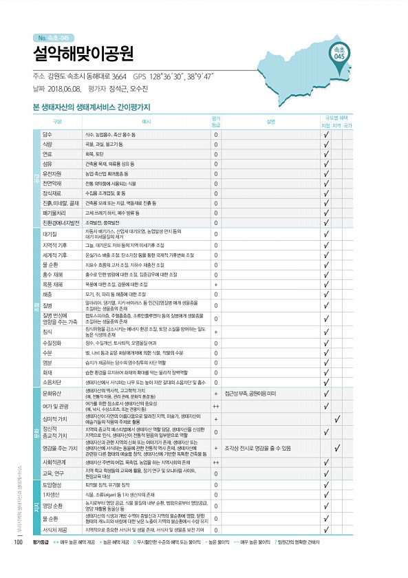 No. 속초- 본 생태자산의 생태계서비스 간이평가지 구분 예시 평가 등급 설명 규모별 혜택 지점 지역 국가 공급 담수 식수, 농업용수, 축산 용수 등 0 √ 식량 곡물, 과실, 물고기 등 0 √ 연료 화목, 토탄 0 √ 섬유 건축용 목재, 의류용 섬유 등 0 √ 유전자원 농업·축산업 희귀품종 등 0 √ 천연약재 전통 의약품에 사용되는 식물 0 √ 장식재료 수집용 조개껍질, 꽃 등 0 √ 진흙,미네랄, 골재 건축용 모래 또는 자갈, 벽돌재료 진흙 등 0 √ 폐기물처리 고체 쓰레기 하치, 폐수 방류 등 0 √ 친환경에너지발전 조력발전, 풍력발전 0 √ 조절 대기질 자동차 배기가스, 산업체 대기오염, 농업발생 먼지 등의 대기 미세물질의 제거 0 √ 지역적 기후 그늘, 대기온도 저하 등의 지역 미세기후 조절 0 √...