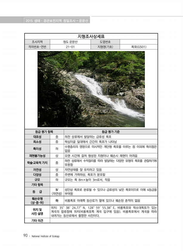 2015 생태·경관보전지역 정밀조사 운문산 90 ? National Institute of Ecology 지형조사상세표 조사지역 청도 운문산 도엽번호 격자번호-연번 21-01 지형명 기호 폭포 GS01 등급 평가 항목 등급 평가 기준 대표성 중 하천 상류에서 발달하는 급류성 폭포 희소성 중 학심이골 일대에서 간간히 폭포가 나타남 특이성 하 수평층리의 영향으로 미시적인 계단형 폭포를 이루는 점 이외에 특이점은 없음 재현불가능성 상 오랜 시간에 걸쳐 형성된 지형이나 훼손시 재현이 어려움 학술?교육적 가치 중 하천 상류에서 수직절리를 따라 발달하는 다양한 유형의 폭포를 관찰하기에 유용함 자연성 상 자연상태를 잘 유지하고 있음 다양성 중 주변에 거력하상, 폭포가 분포함 규모 하 규모는 폭 8m×높이 3m로서, 작음...