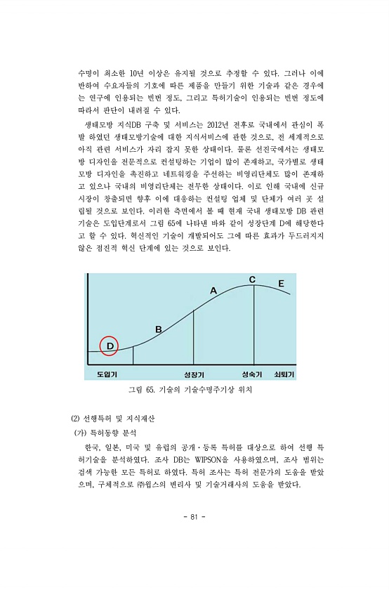 81 수명이 최소한 10년 이상은 유지될 것으로 추정할 수 있다. 그러나 이에 반하여 수요자들의 기호에 따른 제품을 만들기 위한 기술과 같은 경우에 는 연구에 인용되는 빈번 정도, 그리고 특허기술이 인용되는 빈번 정도에 따라서 판단이 내려질 수 있다. 생태모방 지식DB 구축 및 서비스는 2012년 전후로 국내에서 관심이 폭 발 하였던 생태모방기술에 대한 지식서비스에 관한 것으로, 전 세계적으로 아직 관련 서비스가 자리 잡지 못한 상태이다. 물론 선진국에서는 생태모 방 디자인을 전문적으로 컨설팅하는 기업이 많이 존재하고, 국가별로 생태 모방 디자인을 촉진하고 네트워킹을 주선하는 비영리단체도 많이 존재하 고 있으나 국내의 비영리단체는 전무한 상태이다. 이로 인해 국내에 신규 시장이 창출되면 향후 이에 대응하는 ...
