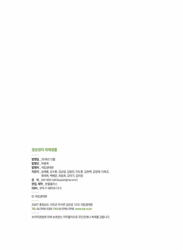 경상권의 외래생물 발행일 _ 2018년 12월 발행인 _ 박용목 발행처 _ 국립생태원 지은이 _ 송해룡, 김수환, 김남영, 김동언, 이도훈, 김현맥, 김영채, 이희조, 류태복, 백혜준, 최동희, 김덕기, 김미정 문 의 _ 041-950-5413 wpixh@nie.re.kr 편집, 제작 _ 한울플러스 ISBN _ 979-11-88154-13-5 ⓒ 국립생태원 33657 충청남도 서천군 마서면 금강로 1210 국립생태원 TEL 041 950-5300 FAX 041 950-5958 www.nie.re.kr ※저작권법에 의해 보호받는 저작물이므로 무단전재나 복제를금합니다.