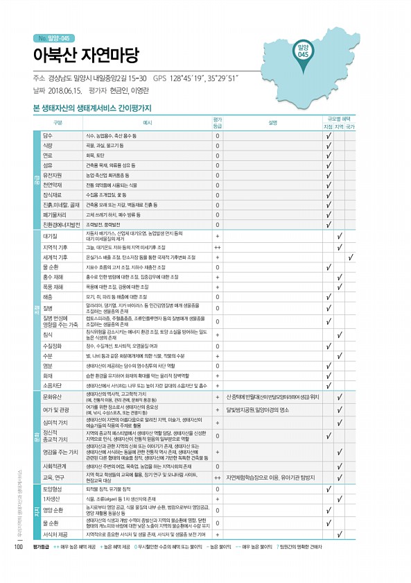 No. 밀양- 본 생태자산의 생태계서비스 간이평가지 구분 예시 평가 등급 설명 규모별 혜택 지점 지역 국가 공급 담수 식수, 농업용수, 축산 용수 등 0 √ 식량 곡물, 과실, 물고기 등 0 √ 연료 화목, 토탄 0 √ 섬유 건축용 목재, 의류용 섬유 등 0 √ 유전자원 농업·축산업 희귀품종 등 0 √ 천연약재 전통 의약품에 사용되는 식물 0 √ 장식재료 수집용 조개껍질, 꽃 등 0 √ 진흙,미네랄, 골재 건축용 모래 또는 자갈, 벽돌재료 진흙 등 0 √ 폐기물처리 고체 쓰레기 하치, 폐수 방류 등 0 √ 친환경에너지발전 조력발전, 풍력발전 0 √ 조절 대기질 자동차 배기가스, 산업체 대기오염, 농업발생 먼지 등의 대기 미세물질의 제거 + √ 지역적 기후 그늘, 대기온도 저하 등의 지역 미세기후 조절 ++ ...