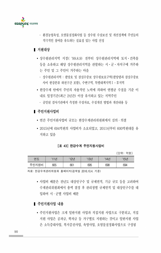 90 환경농업육성, 오염물질정화사업 등 상수원 수질보전 및 개선정책에 주민들의 적극적인 참여를 유도하는 실효성 있는 사업 선정 ? 지원대상 ? 상수원관리지역 지정 ‘99.8.9 전부터 상수원관리지역에 토지?건축물 등을 소유하고 해당 상수원관리지역을 관할하는 시?군?자치구에 거주하 는 주민 및 그 주민이 거주하는 마을 상수원관리지역 팔당호 및 잠실수중보 상수원보호구역 팔당댐과 잠실수중보 사이 한강본류 하천구간 포함 , 수변구역, 특별대책지역ⅠㆍⅡ지역 ? 한강수계 안에서 주민의 자율적인 노력에 의하여 연평균 수질을 기준 이 내로 일정기간 최근 2년간 이상 유지하고 있는 지역주민 공인된 검사기관에서 측정한 수질자료, 수질개선 방법과 개선내용 등 ? 주민지원사업비 ? 연간 주민지원사업비 규모는 한강수계관...