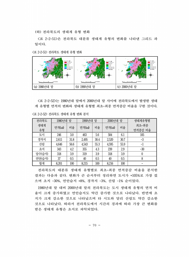 70 하 전라북도의 생태계 유형 변화 표 2-2-51 은 전라북도 대분류 생태계 유형의 변화를 나타낸 그리드 파 일이다. a 1980년대 말 b 1990년대 말 c 2000년대 말 표 2-2-51 전라북도 생태계 유형 변화 표 2-2-52 는 1980년대 말에서 2000년대 말 사이에 전라북도에서 발생한 생태 계 유형별 면적의 변화와 생태계 유형별 최초-최종 면적증감 비율을 구한 것이다. 전라북도 생태계 유형 1980년대 말 1990년대 말 2000년대 말 생태계유형별 최초-최종 면적 ㎢ 비율 면적 ㎢ 비율 면적 ㎢ 비율 면적증감 비율 도시 246 3.0 463 5.6 504 6.1 105 경작지 2,611 31.8 2,495 30.4 2,520 30.7 -3 산림 4,646 56.6 4,543 55.3 4...