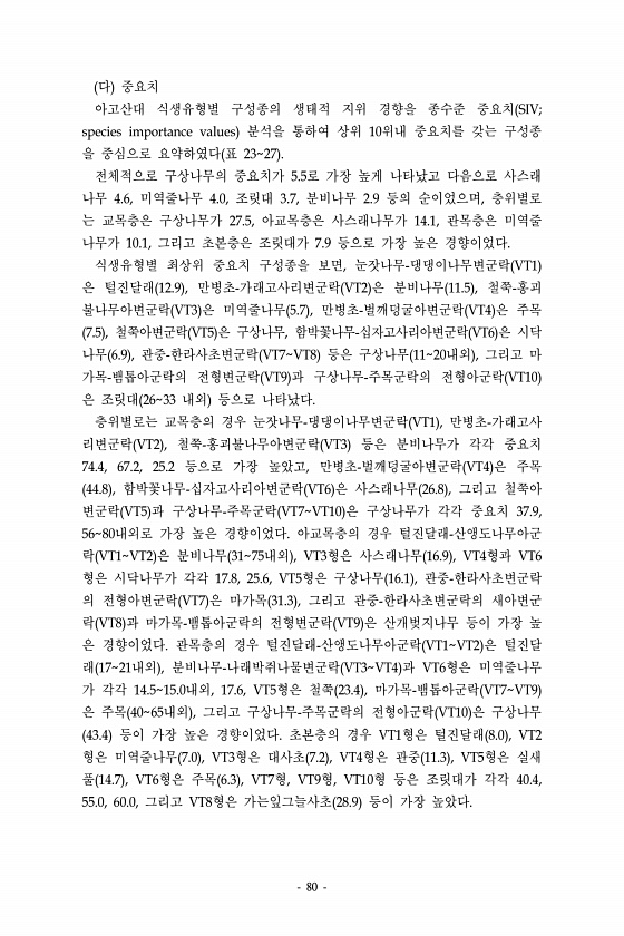 80 다 중요치 아고산대 식생유형별 구성종의 생태적 지위 경향을 종수준 중요치 SIV; species importance values 분석을 통하여 상위 10위내 중요치를 갖는 구성종 을 중심으로 요약하였다 표 2327 전체적으로 구상나무의 중요치가 5.5로 가장 높게 나타났고 다음으로 사스래 나무 4.6, 미역줄나무 4.0, 조릿대 3.7, 분비나무 2.9 등의 순이었으며, 층위별로 는 교목층은 구상나무가 27.5, 아교목층은 사스래나무가 14.1, 관목층은 미역줄 나무가 10.1, 그리고 초본층은 조릿대가 7.9 등으로 가장 높은 경향이었다. 식생유형별 최상위 중요치 구성종을 보면, 눈잣나무-댕댕이나무변군락 VT1 은 털진달래 12.9 , 만병초-가래고사리변군락 VT2 은 분비나무 11.5 , 철쭉-홍괴...