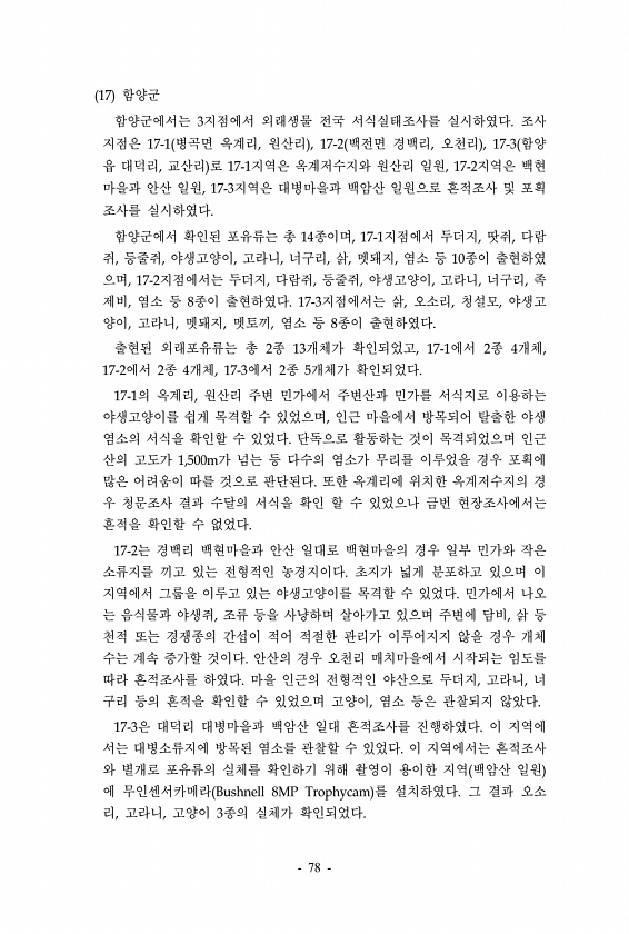 17 함양군 함양군에서는 3지점에서 외래생물 전국 서식실태조사를 실시하였다. 조사 지점은 17-1 병곡면 옥계리, 원산리 , 17-2 백전면 경백리, 오천리 , 17-3 함양 읍 대덕리, 교산리 로 17-1지역은 옥계저수지와 원산리 일원, 17-2지역은 백현 마을과 안산 일원, 17-3지역은 대병마을과 백암산 일원으로 흔적조사 및 포획 조사를 실시하였다. 함양군에서 확인된 포유류는 총 14종이며, 17-1지점에서 두더지, 땃쥐, 다람 쥐, 등줄쥐, 야생고양이, 고라니, 너구리, 삵, 멧돼지, 염소 등 10종이 출현하였 으며, 17-2지점에서는 두더지, 다람쥐, 등줄쥐, 야생고양이, 고라니, 너구리, 족 제비, 염소 등 8종이 출현하였다. 17-3지점에서는 삵, 오소리, 청설모, 야생고 양이, 고라니, 멧돼지...