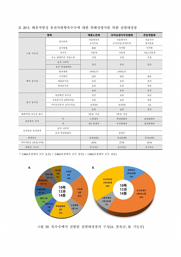 표 20-3. 해충저항성 유전자변형옥수수에 대한 위해성평가를 위한 실험대상종 항목 애꽃노린재 꼬마남생이무당벌레 큰집게벌레 노출 가능성 섭식부위 식물체서식 초식곤충 식물체서식 초식곤충/천적곤충 지표서식 절지동물 섭식방법 흡즙 저작형 저작형 서식처 식물체 식물체 지표/식물체 독소 발현부위 직접노출 간접 간접 간접 표적 나비목 중간 중간 중간 표적 딱정벌레목 획득 용이성 발생세대 2세대/년 2세대/년 기주범위 넓음 넓음 넓음 채집용이성 높음 높음 중간 분양용이성 높음 높음 낮음 높음 높음 중간 평가 용이성 육안확인 용이성 중간 높음 높음 사육용이성 대량사육 높음 높음 낮음 먹이공급용이 인공사료 높음 O 높음 O x 높음 높음 중간 화학약제 감수성 평가 5종류 이상 5종류 이상 분류학적 위치 목 노린재목 딱정벌레목...
