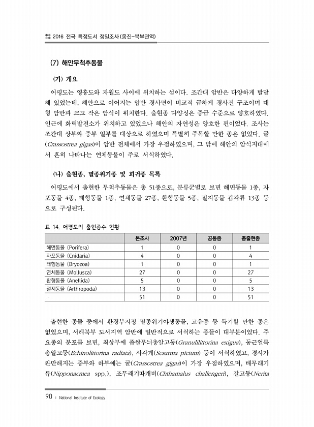 2016 전국 특정도서 정밀조사 옹진-북부권역 90 ? National Institute of Ecology 7 해안무척추동물 가 개요 어평도는 영흥도와 자월도 사이에 위치하는 섬이다. 조간대 암반은 다양하게 발달 해 있었는데, 해안으로 이어지는 암반 경사면이 비교적 급하게 경사진 구조이며 대 형 암반과 크고 작은 암석이 위치한다. 출현종 다양성은 중급 수준으로 양호하였다. 인근에 화력발전소가 위치하고 있었으나 해안의 자연성은 양호한 편이었다. 조사는 조간대 상부와 중부 일부를 대상으로 하였으며 특별히 주목할 만한 종은 없었다. 굴 Crassostrea gigas 이 암반 전체에서 가장 우점하였으며, 그 밖에 해안의 암석지대에 서 흔히 나타나는 연체동물이 주로 서식하였다. 나 출현종, 멸종위기종 및 희귀종 ...