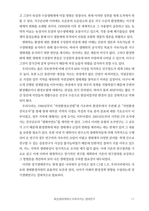 육상생태계에서 이루어지는 생태연구 11 고 그것이 육상과 수중생태계에 미칠 영향은 엄청나다. 현재 이러한 징후를 세계 도처에서 엿 볼 수 있다. 지구온난화 이외에도 오존층의 오존감소와 같은 지구 수준의 환경변화는 지구생 태계의 변화를 초래할 것이다. 1950년대 이후 전 세계적으로 그 사용량이 급증하고 있는 농 약과 비료는 농경지의 토양과 담수생태계를 오염시키고 있으며, 각종 유해 폐기물들은 생태 계의 물질순환을 통해 다시 생물체에 축적되어 인류를 포함한 생물의 생존을 위협하고 있다. 변화하는 환경에 대한 생태계 구성원의 반응에 대한 이해는 인류의 생존과 지속가능한 지 구생태계를 유지하기 위해 필수적이다. 따라서 생태학의 궁극적인 목표가 지속가능한 지구 생태계를 유지하기 위한 방안을 제시하는 것이라는 점은 ...