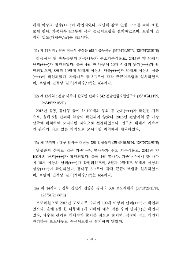 78 개체 이상의 성충 +++ 이 확인되었다. 지난해 감로 인한 그으름 피해 또한 눈에 띈다. 가죽나무 4그루에 각각 끈끈이트랩을 설치하였으며, 트랩의 면 적당 밀도 개체수/㎡ 는 325이다. 11 제 11지역 전북 정읍시 수성동 615-1 충무공원 35°3410.57N, 126°5127.51E 정읍시청 뒤 충무공원의 가죽나무가 주요기주식물로, 2015년 약 50개의 난괴 +++ 가 확인되었다. 올해 4월 한 나무에 10개 이상의 난괴 +++ 가 확 인되었으며, 8월과 10월에 50개체 이상의 약충 +++ 과 30개체 이상의 성충 +++ 이 확인되었다. 가죽나무 등 3그루에 각각 끈끈이트랩을 설치하였으 며, 트랩의 면적당 밀도 개체수/㎡ 는 434이다. 12 제 12지역 전남 나주시 산포면 산제리 542 전...