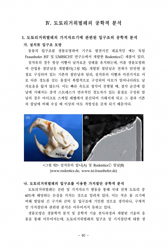80 Ⅳ. 도토리거위벌레의 공학적 분석 1. 도토리거위벌레의 가지자르기에 관련된 입구조의 공학적 분석 가. 설치류 입구조 모방 동물의 입구조를 생물모방하여 기구로 발전시킨 대표적인 예는 독일 Fraunhofer IST 및 UMISICHT 연구소에서 개발한 Rodentics? 제품이 있다. 설치류의 경우 항상 이빨이 날카로운 상태를 유지하는데, 이를 생물모방하 여 산업용 절단날을 개발했다 그림 92 개발된 절단날은 전체가 단단한 물 질로 구성되어 있는 기존의 절단날과 달리, 설치류의 이빨과 마찬가지로 서 로 다른 경도를 갖는 물질이 복합적으로 구성되어 마모가 일어나더라도 날 카로움을 잃지 않는다. 이는 빠른 속도로 절삭이 진행될 때, 절삭 순간에 칼 날에 가해지는 충격 스트레스가 연속적인 경도차가 있는 물질로...