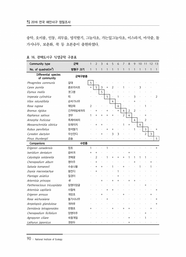 2016 전국 해안사구 정밀조사 90 ? National Institute of Ecology Community type 군락 1 2 3 4 5 6 7 8 9 10 11 12 13 No. of quadrat m2 방형구 크기 1 1 1 1 1 1 1 1 1 1 1 1 1 Differential species of community 군락구분종 Phragmites communis 갈대 5 ? ? ? ? ? ? ? ? ? ? ? ? Carex pumila 좀보리사초 + 5 3 + 2 ? 1 ? ? 3 ? ? Elymus mollis 갯그령 ? ? 5 ? ? ? ? ? ? ? ? ? Imperata cylindrica 띠 ? ? ? 5 ? 1 ? ? 3 ? ? ? 2 Vitex rotundifolia 순비기나무 4...