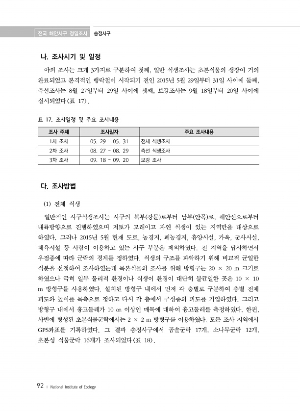 전국 해안사구 정밀조사 송정사구 92 ? National Institute of Ecology 나. 조사시기 및 일정 야외 조사는 크게 3가지로 구분하여 첫째, 일반 식생조사는 초본식물의 생장이 거의 완료되었고 본격적인 행락철이 시작되기 전인 2015년 5월 29일부터 31일 사이에 둘째, 측선조사는 8월 27일부터 29일 사이에 셋째, 보강조사는 9월 18일부터 20일 사이에 실시되었다 표 17 조사 주제 조사일자 주요 조사내용 1차 조사 05. 29 ? 05. 31 전체 식생조사 2차 조사 08. 27 ? 08. 29 측선 식생조사 3차 조사 09. 18 ? 09. 20 보강 조사 표 17. 조사일정 및 주요 조사내용 다. 조사방법 1 전체 식생 일반적인 사구식생조사는 사구의 북부 강문 로부터 남부 안목...