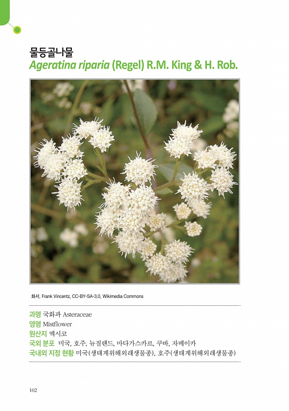102 물등골나물 Ageratina riparia Regel R.M. King & H. Rob. 과명 국화과 Asteraceae 영명 Mistflower 원산지 멕시코 국외 분포 미국, 호주, 뉴질랜드, 마다가스카르, 쿠바, 자메이카 국내외 지정 현황 미국 생태계위해외래생물종 , 호주 생태계위해외래생물종 화서. Frank Vincentz, CC-BY-SA-3.0, WikimediaCommons