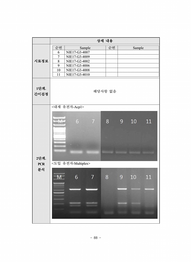 88 상세 내용 시료정보 순번 Sample 순번 Sample 6 NIE17-G3-4007 7 NIE17-G3-4009 8 NIE17-G2-4002 9 NIE17-G3-4006 10 NIE17-G3-4008 11 NIE17-G3-4010 1단계. 간이검정 해당사항 없음 2단계. PCR 분석 내재 유전자-Acp1 도입 유전자-Multiplex