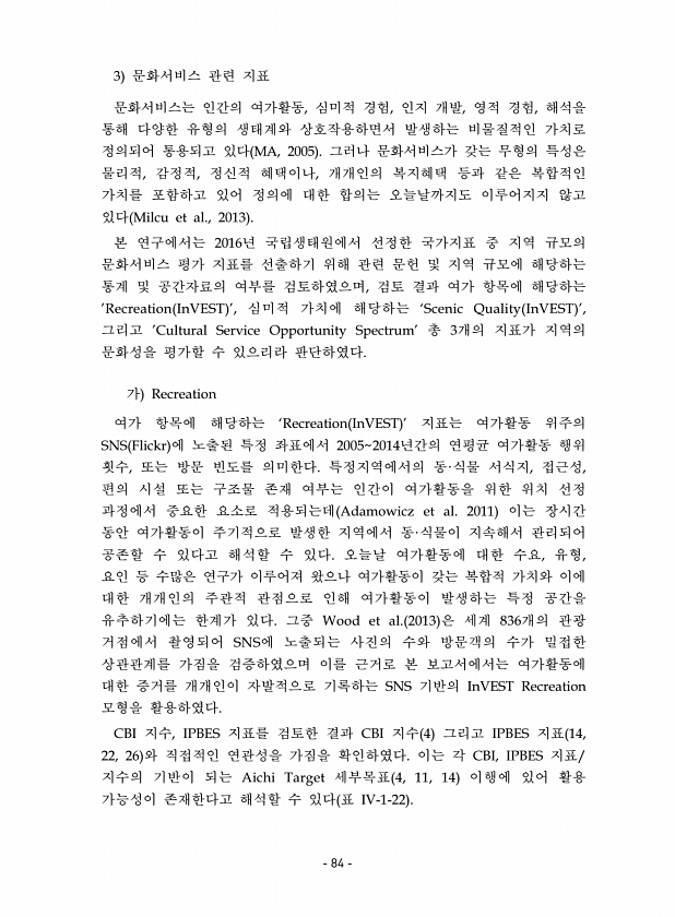 3 문화서비스 관련 지표 문화서비스는 인간의 여가활동, 심미적 경험, 인지 개발, 영적 경험, 해석을 통해 다양한 유형의 생태계와 상호작용하면서 발생하는 비물질적인 가치로 정의되어 통용되고 있다 MA, 2005 그러나 문화서비스가 갖는 무형의 특성은 물리적, 감정적, 정신적 혜택이나, 개개인의 복지혜택 등과 같은 복합적인 가치를 포함하고 있어 정의에 대한 합의는 오늘날까지도 이루어지지 않고 있다 Milcu et al., 2013 본 연구에서는 2016년 국립생태원에서 선정한 국가지표 중 지역 규모의 문화서비스 평가 지표를 선출하기 위해 관련 문헌 및 지역 규모에 해당하는 통계 및 공간자료의 여부를 검토하였으며, 검토 결과 여가 항목에 해당하는 ’Recreation InVEST ’, 심미적 가치에 해당하는 ‘...