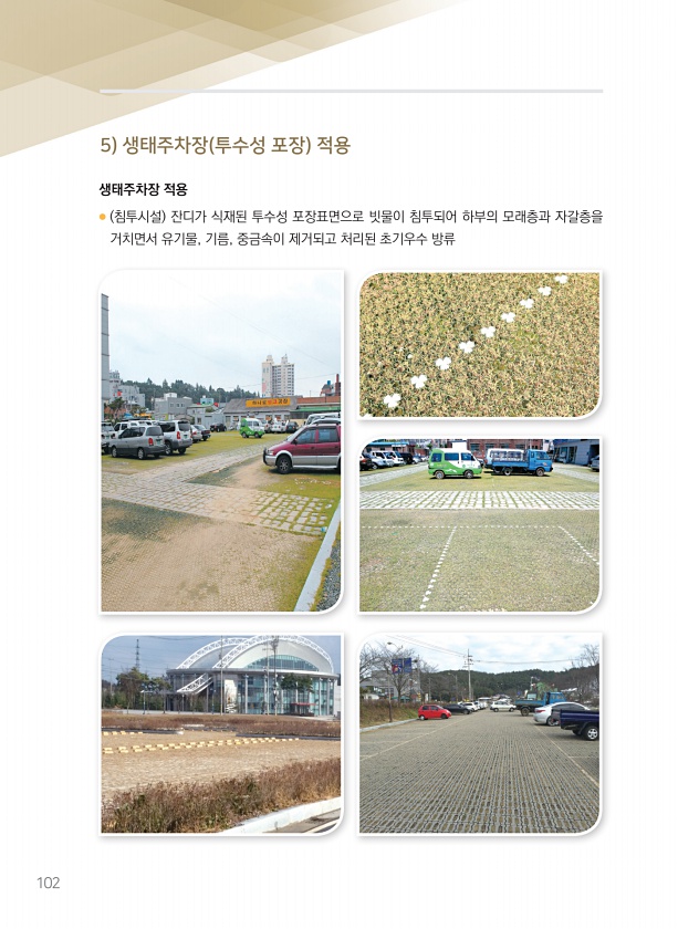 102 5 생태주차장 투수성 포장 적용 생태주차장 적용 ● 침투시설 잔디가 식재된 투수성 포장표면으로 빗물이 침투되어 하부의 모래층과 자갈층을 거치면서 유기물, 기름, 중금속이 제거되고 처리된 초기우수방류