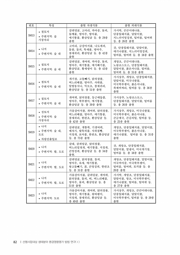 번호 특징 출현 자생식물 출현 외래식물 SM13 ? 절토지 ? 주변지역숲 가장자리 갈퀴덩굴, 고마리, 까마중, 돌피, 들깨풀, 명아주, 방아풀, 애기똥풀, 환삼덩굴 등. 총 29종 출현 가시박, 끈끈이대나물, 단풍잎돼지풀, 달맞이꽃, 지느러미엉겅퀴, 털비름, 털여뀌 등. 총 26종 출현 SM14 ? 나지 ? 주변지역숲 내 고마리, 금강아지풀, 나도개피, 돌콩, 돌피, 뚝새풀, 명아주, 참새귀리, 환삼덩굴 등. 총 42종 출현 갓, 단풍잎돼지풀, 달맞이꽃, 애기나팔꽃, 지느러미엉겅퀴, 털비름, 털여뀌 등. 총 18종 출현 SM15 ? 절토지 ? 주변지역숲 내 갈퀴덩굴, 개여뀌, 까마중, 돌피, 명아주, 애기똥풀, 애기쐐기풀, 환삼덩굴, 황새냉이 등. 총 43종 출현 개망초, 끈끈이대나물, 노랑코스모스, 단풍잎...