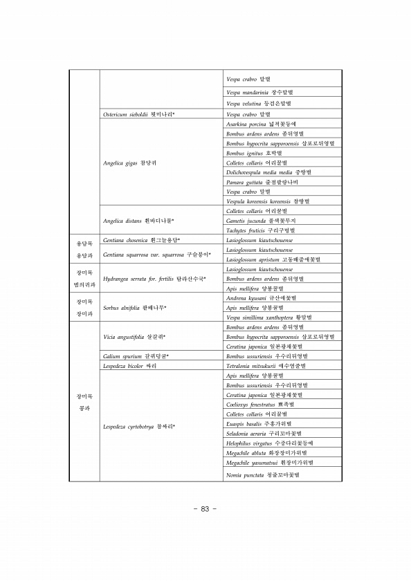 83 Vespa crabro 말벌 Vespa mandarinia 장수말벌 Vespa velutina 등검은말벌 Ostericum sieboldii 묏미나리* Vespa crabro 말벌 Angelica gigas 참당귀 Asarkina porcina 넓적꽃등에 Bombus ardens ardens 좀뒤영벌 Bombus hypocrita sapporoensis 삽포로뒤영벌 Bombus ignitus 호박벌 Colletes collaris 어리꿀벌 Dolichovespula media media 중땅벌 Pamara guttata 줄점팔랑나비 Vespa crabro 말벌 Vespula koreensis koreensis 참땅벌 Angelica distans 흰바디나물* Colletes collaris 어리꿀벌 G...