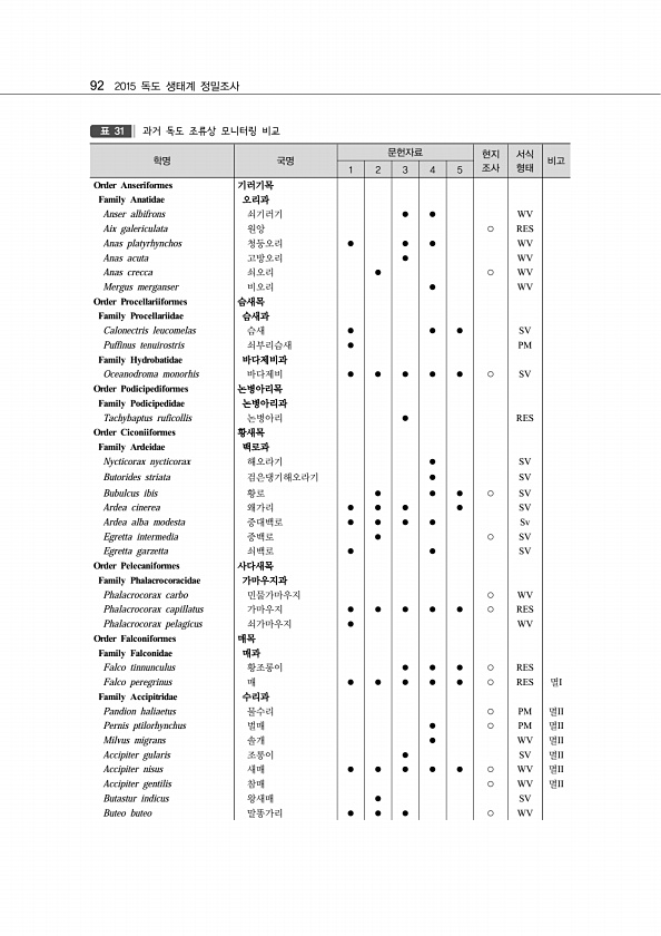 92 2015 독도 생태계 정밀조사 학명 국명 문헌자료 현지 조사 서식 1 2 3 4 5 형태 비고 Order Anseriformes 기러기목 Family Anatidae 오리과 Anser albifrons 쇠기러기 ● ● WV Aix galericulata 원앙 ○ RES Anas platyrhynchos 청둥오리 ● ● ● WV Anas acuta 고방오리 ● WV Anas crecca 쇠오리 ● ○ WV Mergus merganser 비오리 ● WV Order Procellariiformes 슴새목 Family Procellariidae 슴새과 Calonectris leucomelas 슴새 ● ● ● SV Puffinus tenuirostris 쇠부리슴새 ● PM Family Hydrobatidae 바...