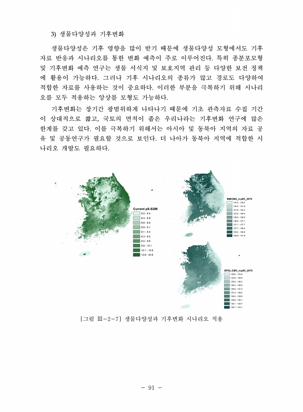 91 3 생물다양성과 기후변화 생물다양성은 기후 영향을 많이 받기 때문에 생물다양성 모형에서도 기후 자료 반응과 시나리오를 통한 변화 예측이 주로 이루어진다. 특히 종분포모형 및 기후변화 예측 연구는 생물 서식지 및 보호지역 관리 등 다양한 보전 정책 에 활용이 가능하다. 그러나 기후 시나리오의 종류가 많고 경로도 다양하여 적합한 자료를 사용하는 것이 중요하다. 이러한 부분을 극복하기 위해 시나리 오를 모두 적용하는 앙상블 모형도 가능하다. 기후변화는 장기간 광범위하게 나타나기 때문에 기초 관측자료 수집 기간 이 상대적으로 짧고, 국토의 면적이 좁은 우리나라는 기후변화 연구에 많은 한계를 갖고 있다. 이를 극복하기 위해서는 아시아 및 동북아 지역의 자료 공 유 및 공동연구가 필요할 것으로 보인다. 더 나아가...