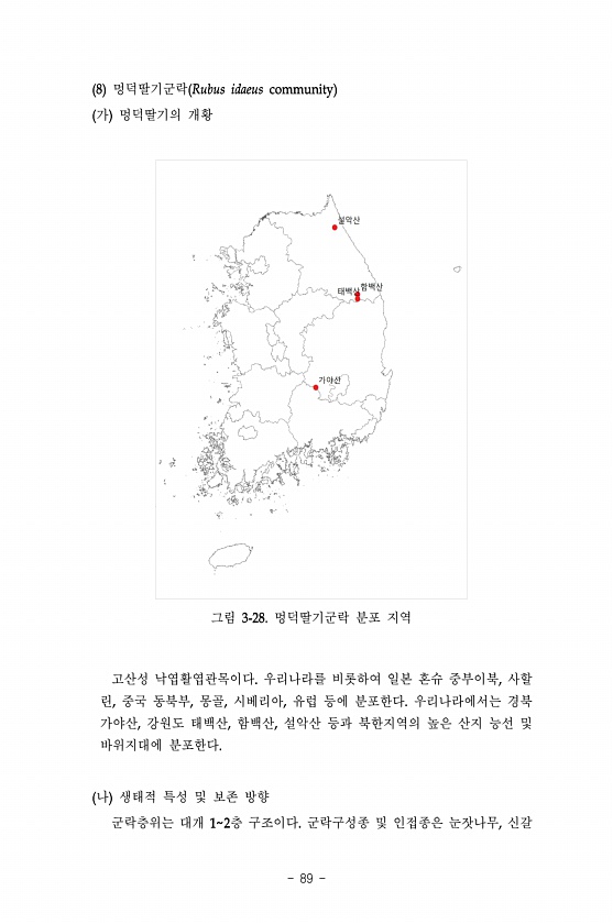 89 멍덕딸기군락 가 멍덕딸기의 개황 그림 멍덕딸기군락 분포 지역 고산성 낙엽활엽관목이다 우리나라를 비롯하여 일본 혼슈 중부이북 사할 린 중국 동북부 몽골 시베리아 유럽 등에 분포한다 우리나라에서는 경북 가야산 강원도 태백산 함백산 설악산 등과 북한지역의 높은 산지 능선 및 바위지대에 분포한다 나 생태적 특성 및 보존 방향 군락층위는 대개 층 구조이다 군락구성종 및 인접종은 눈잣나무신갈