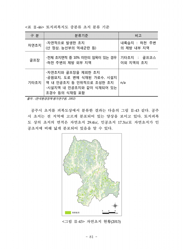81 구 분 분류기준 비고 자연초지 -자연적으로 발생한 초지 산 정상, 능선부의 억새군란 등 내륙습지 하천 주변 의 제방 내부 지역 골프장 -전체 초지면적 중 10% 미만의 임목이 있는 경우 -하천 주변의 제방 외부 지역 기타초지 골프코스 이외 지역의 초지 기타초지 -자연초지와 골프장을 제외한 초지 -공원묘지, 도로 변에 식재된 가로수, 시설지 역 내 인공초지 등 인위적으로 조성한 초지 -시설지역 내 인공초지와 같이 식재되어 있는 조경수 등의 식재림 포함 n/a 출처: 한국환경정책·평가연구원, 2002 표 토지피복지도 중분류 초지 분류 기준 공주시 초지를 피복도상에서 분류한 결과는 다음의 그림 같다 공주 시 초지는 전 지역에 고르게 분포되어 있는 양상을 보이고 있다 토지피복 도 상의 초지의 면적은 자연초지 ...