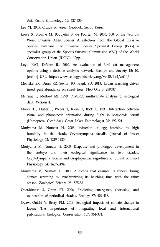 Asia-Pacific Entomology 15627-630. Lee YJ. 2005. Cicada of korea. Geobook. Seoul, Korea. Lowe S, Browne M, Boudjelas S, de Poorter M. 2000. 100 of the World’s Worst Invasive Alien Species A selection from the Global Invasive Species Database. The Invasive Species Specialist Group ISSG a specialist group of the Species Survival Commission SSC of the World Conservation Union IUCN 12pp. Loyd KAT, DeV...