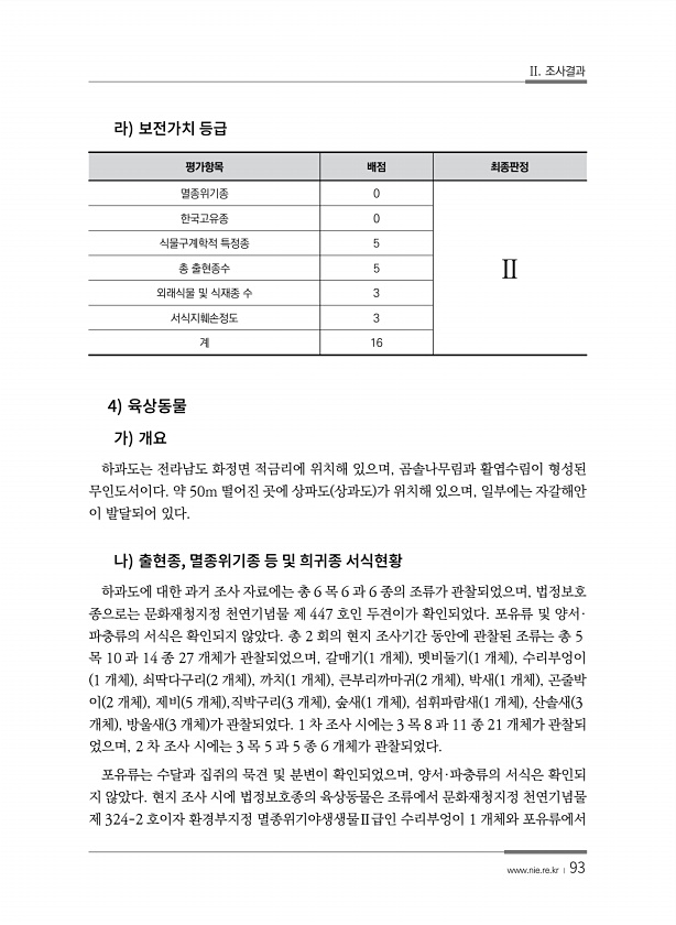 II. 조사결과 www.nie.re.kr ? 93 평가항목 배점 최종판정 멸종위기종 0 Ⅱ 한국고유종 0 식물구계학적 특정종 5 총 출현종수 5 외래식물 및 식재종 수 3 서식지훼손정도 3 계 16 4 하과도는 전라남도 화정면 적금리에 위치해 있으며, 곰솔나무림과 활엽수림이 형성된 무인도서이다. 약 50m 떨어진 곳에 상파도 상과도 가 위치해 있으며, 일부에는 자갈해안 이 발달되어 있다. , 하과도에 대한 과거 조사 자료에는 총 6 목 6 과 6 종의 조류가 관찰되었으며, 법정보호 종으로는 문화재청지정 천연기념물 제 447 호인 두견이가 확인되었다. 포유류 및 양서· 파충류의 서식은 확인되지 않았다. 총 2 회의 현지 조사기간 동안에 관찰된 조류는 총 5 목 10 과 14 종 27 개체가 관찰되었으며, 갈매...