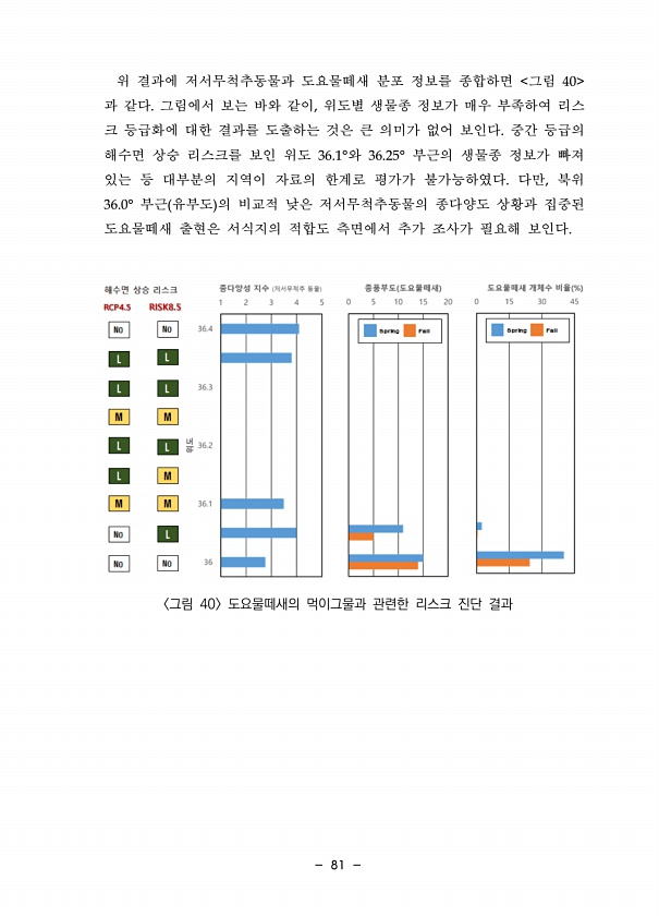 81 위 결과에 저서무척추동물과 도요물떼새 분포 정보를 종합하면 그림 40 과 같다. 그림에서 보는 바와 같이, 위도별 생물종 정보가 매우 부족하여 리스 크 등급화에 대한 결과를 도출하는 것은 큰 의미가 없어 보인다. 중간 등급의 해수면 상승 리스크를 보인 위도 36.1°와 36.25° 부근의 생물종 정보가 빠져 있는 등 대부분의 지역이 자료의 한계로 평가가 불가능하였다. 다만, 북위 36.0° 부근 유부도 의 비교적 낮은 저서무척추동물의 종다양도 상황과 집중된 도요물떼새 출현은 서식지의 적합도 측면에서 추가 조사가 필요해 보인다. 그림 40 도요물떼새의 먹이그물과 관련한 리스크 진단결과
