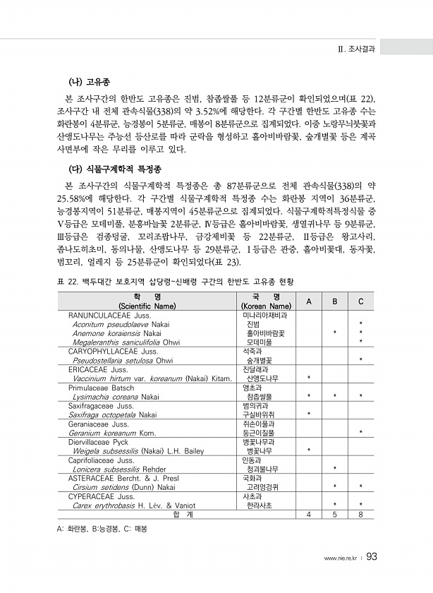 Ⅱ. 조사결과 www.nie.re.kr ? 93 나 고유종 본 조사구간의 한반도 고유종은 진범, 참좁쌀풀 등 12분류군이 확인되었으며 표 22 , 조사구간 내 전체 관속식물 338 의 약 3.52%에 해당한다. 각 구간별 한반도 고유종 수는 화란봉이 4분류군, 능경봉이 5분류군, 매봉이 8분류군으로 집계되었다. 이중 노랑무늬붓꽃과 산앵도나무는 주능선 등산로를 따라 군락을 형성하고 홀아비바람꽃, 숲개별꽃 등은 계곡 사면부에 작은 무리를 이루고 있다. 다 식물구계학적 특정종 본 조사구간의 식물구계학적 특정종은 총 87분류군으로 전체 관속식물 338 의 약 25.58%에 해당한다. 각 구간별 식물구계학적 특정종 수는 화란봉 지역이 36분류군, 능경봉지역이 51분류군, 매봉지역이 45분류군으로 집계되었다. 식물구계...