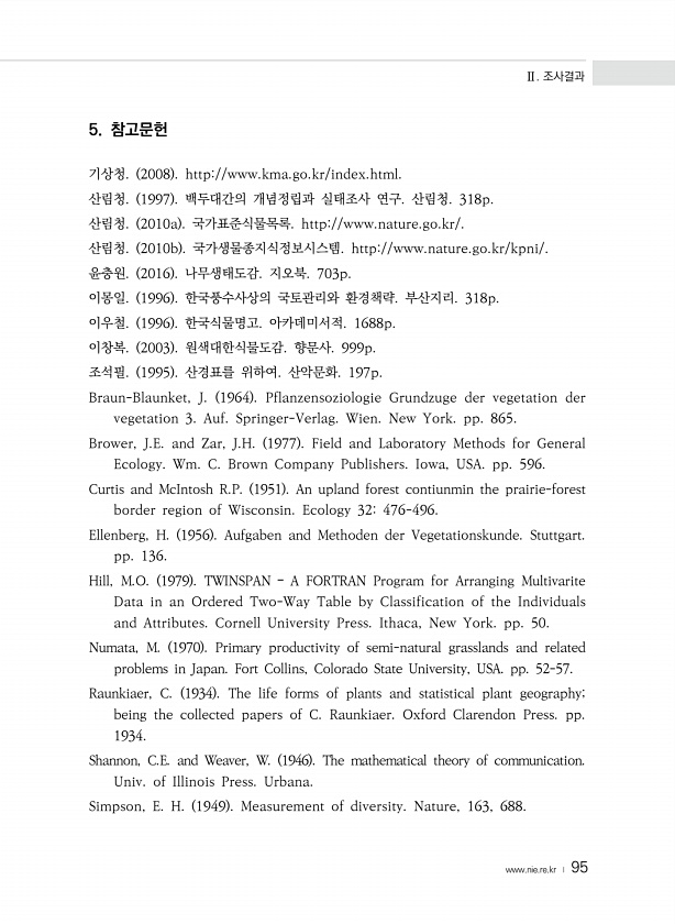 Ⅱ. 조사결과 www.nie.re.kr ? 95 5. 참고문헌 기상청. 2008 http//www.kma.go.kr/index.html. 산림청. 1997 백두대간의 개념정립과 실태조사 연구. 산림청. 318p. 산림청. 2010a 국가표준식물목록. http//www.nature.go.kr/. 산림청. 2010b 국가생물종지식정보시스템. http//www.nature.go.kr/kpni/. 윤충원. 2016 나무생태도감. 지오북. 703p. 이몽일. 1996 한국풍수사상의 국토관리와 환경책략. 부산지리. 318p. 이우철. 1996 한국식물명고. 아카데미서적. 1688p. 이창복. 2003 원색대한식물도감. 향문사. 999p. 조석필. 1995 산경표를 위하여. 산악문화. 197p. Braun-Blaunke...