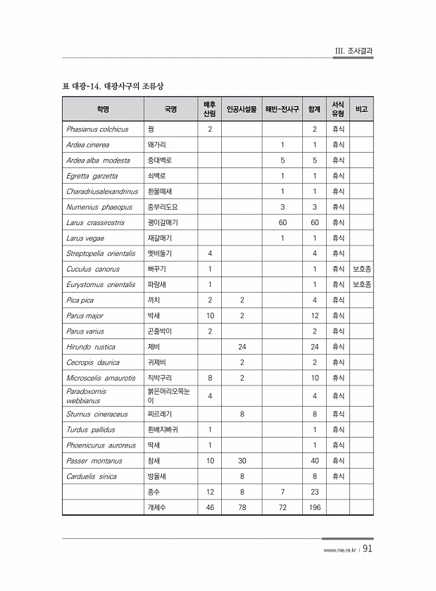 III. 조사결과 www.nie.re.kr ? 91 학명 국명 배후 산림 인공시설물 해빈-전사구 합계 서식 유형 비고 Phasianus colchicus 꿩 2 2 휴식 Ardea cinerea 왜가리 1 1 휴식 Ardea alba modesta 중대백로 5 5 휴식 Egretta garzetta 쇠백로 1 1 휴식 Charadriusalexandrinus 흰물떼새 1 1 휴식 Numenius phaeopus 중부리도요 3 3 휴식 Larus crassirostris 괭이갈매기 60 60 휴식 Larus vegae 재갈매기 1 1 휴식 Streptopelia orientalis 멧비둘기 4 4 휴식 Cuculus canorus 뻐꾸기 1 1 휴식 보호종 Eurystomus orientalis 파랑새 1 1...