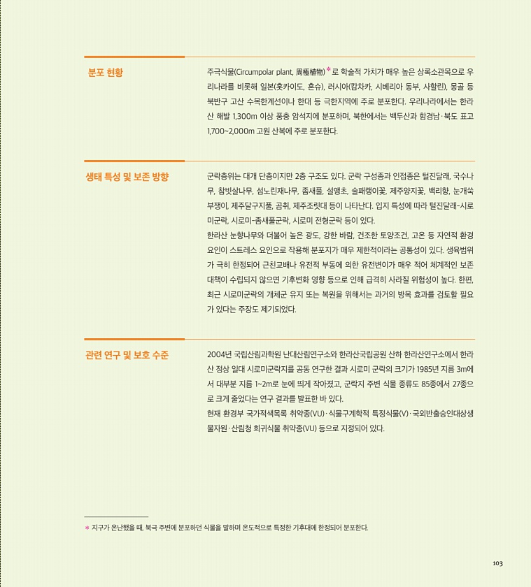 분포 현황 주극식물 Circumpolar plant, 周極植物 ?로 학술적 가치가 매우 높은 상록소관목으로 우 리나라를 비롯해 일본 홋카이도, 혼슈 , 러시아 캄차카, 시베리아 동부, 사할린 , 몽골 등 북반구 고산 수목한계선이나 한대 등 극한지역에 주로 분포한다. 우리나라에서는 한라 산 해발 1,300m 이상 풍충 암석지에 분포하며, 북한에서는 백두산과 함경남·북도 표고 1,7002,000m 고원 산복에 주로 분포한다. 생태 특성 및 보존 방향 군락층위는 대개 단층이지만 2층 구조도 있다. 군락 구성종과 인접종은 털진달래, 국수나 무, 참빗살나무, 섬노린재나무, 좀새풀, 설앵초, 술패랭이꽃, 제주양지꽃, 백리향, 눈개쑥 부쟁이, 제주달구지풀, 곰취, 제주조릿대 등이 나타난다. 입지 특성에 따라 털진달래-시...