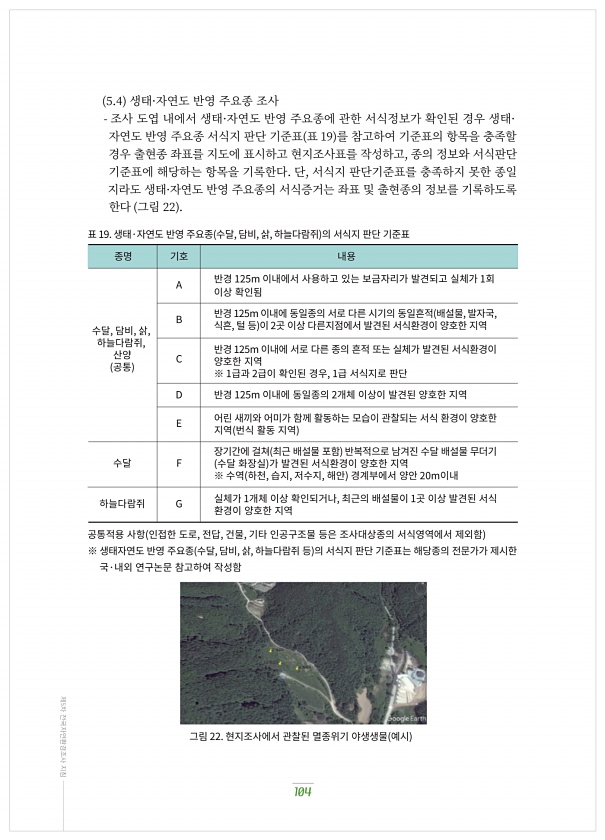 ?.? 생태·자연도?반영?주요종?조사 조사?도엽?내에서?생태·자연도?반영?주요종에?관한?서식정보가?확인된?경우?생태· 자연도?반영?주요종?서식지?판단?기준표 표 ?? 를?참고하여?기준표의?항목을?충족할 경우?출현종?좌표를?지도에?표시하고?현지조사표를?작성하고, 종의?정보와?서식판단 기준표에?해당하는?항목을?기록한다. 단, 서식지?판단기준표를?충족하지?못한?종일 지라도?생태·자연도?반영?주요종의?서식증거는?좌표?및?출현종의?정보를?기록하도록 한다 그림 ?? 표 19. 생태·자연도?반영?주요종 수달, 담비, 삵, 하늘다람쥐 의?서식지?판단?기준표 종명 기호 내용 A B C D E F G 수달, 담비, 삵, 하늘다람쥐, 산양 공통 수달 하늘다람쥐 공통적용?사항 인접한?도로, 전답, 건물, 기타?인공구조물?등은?조...