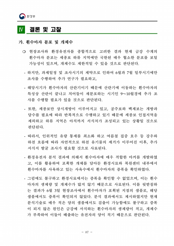 87 Ⅳ 결론 및 고찰 가. 흰수마자 분포 및 개체수 ? 현장조사와 환경유전자를 종합적으로 고려한 결과 현재 금강 수계의 흰수마자 분포는 세종보 하류 지역에만 국한된 매우 협소한 분포를 보일 가능성이 있으며, 개체수도 제한적일 수 있을 것으로 판단된다. 하지만, 과제일정 및 조사시기의 제약으로 인하여 6월과 7월 일부시기에만 조사를 수행하여 추가 연구가 필요하고, 해당시기가 흰수마자의 산란기이기 때문에 산란기에 이동하는 흰수마자의 특성상 산란이 끝나고 치어들이 재분포하는 시기인 9∼10월경에 추가 조 사를 수행할 필요가 있을 것으로 판단된다. 또한, 세종보만 상시개방이 이루어지고 있고, 공주보와 백제보는 개방과 담수를 필요에 따라 반복적으로 수행하고 있기 때문에 세종보 인접지역을 제외하고 하류 지역은 아직까...