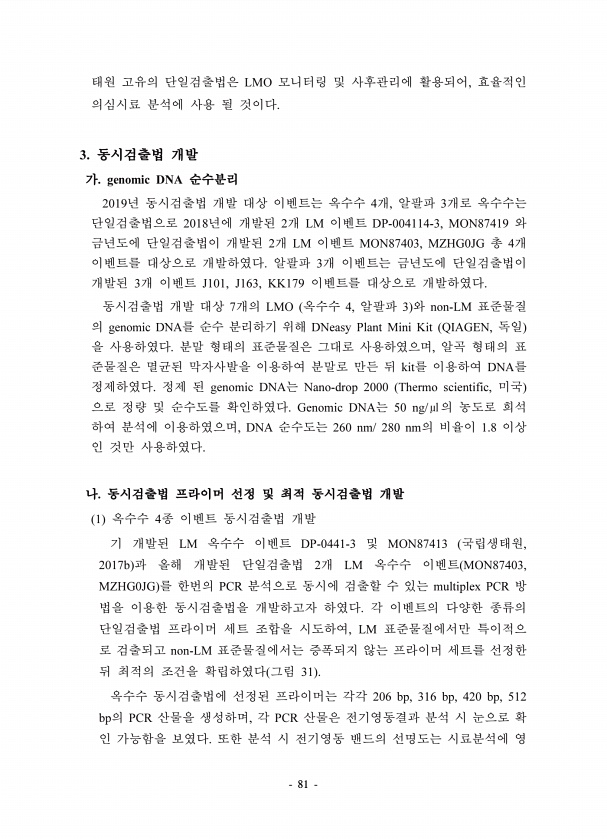 81 LMO , 3. genomic DNA 2019 4 , 3 2018 2 LM DP-004114-3, MON87419 2 LM MON87403, MZHG0JG 4 3 3 J101, J163, KK179 7 LMO 4, 3 non-LM genomic DNA DNeasy Plant Mini Kit QIAGEN, , kit DNA genomic DNA Nano-drop 2000 Thermo scientific, Genomic DNA 50 ng/ , DNA 260 nm/ 280 nm 1.8 1 4 LM DP-0441-3 MON87413 , 2017b 2 LM MON87403, MZHG0JG PCR multiplex PCR , LM non-LM 31 206 bp, 316 bp, 420 bp, 512 bp PCR ,...