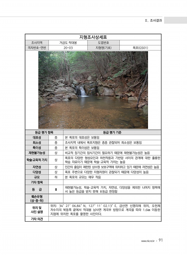 Ⅱ. 조사결과 www.nie.re.kr ? 91 지형조사상세표 조사지역 거금도 적대봉 도엽번호 격자번호-연번 20-03 지형명 기호 폭포 GS01 등급 평가 항목 등급 평가 기준 대표성 중 본 폭포의 대표성은 보통임 희소성 중 조사지역 내에서 폭포지형은 종종 관찰되어 희소성은 보통임 특이성 중 본 폭포의 특이성은 보통임 재현불가능성 상 비교적 장기간의 침식기간이 필요하기 때문에 재현불가능성은 높음 학술?교육적 가치 상 폭포의 다양한 형성요인과 하천작용과 기반암 사이의 관계에 대한 훌륭한 학습 자료이기 때문에 학술·교육적 가치는 높음 자연성 상 인간의 출입이 제한된 상수원 보호구역에 위치하고 있기 때문에 자연성은 높음 다양성 상 폭포 주변으로 다양한 지형자원이 관찰되기 때문에 다양성이 높음 규모 하 본 폭포의...