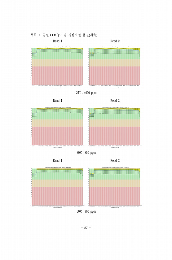87 부록 1. 일별·CO2 농도별 생산서열 품질 계속 Read 1 Read 2 26℃, 4000 ppm Read 1 Read 2 30℃, 350 ppm Read 1 Read 2 30℃, 700ppm