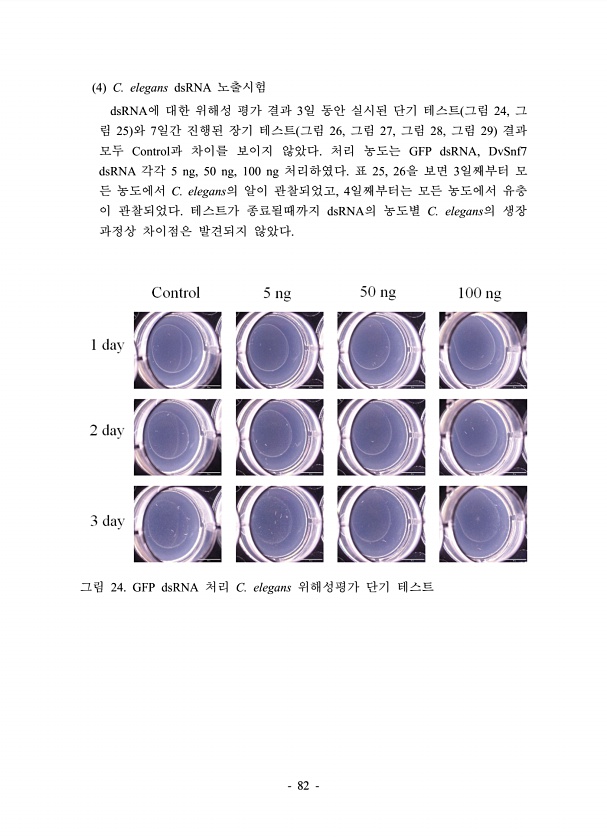 82 4 C. elegans dsRNA 노출시험 dsRNA에 대한 위해성 평가 결과 3일 동안 실시된 단기 테스트 그림 24, 그 림 25 와 7일간 진행된 장기 테스트 그림 26, 그림 27, 그림 28, 그림 29 결과 모두 Control과 차이를 보이지 않았다. 처리 농도는 GFP dsRNA, DvSnf7 dsRNA 각각 5 ng, 50 ng, 100 ng 처리하였다. 표 25, 26을 보면 3일째부터 모 든 농도에서 C. elegans의 알이 관찰되었고, 4일째부터는 모든 농도에서 유충 이 관찰되었다. 테스트가 종료될때까지 dsRNA의 농도별 C. elegans의 생장 과정상 차이점은 발견되지 않았다. 그림 24. GFP dsRNA 처리 C. elegans 위해성평가 단기테스트