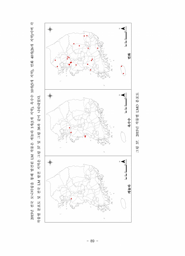 2015년 전국 모니터링을 통해 발견된 LM 작물은 캐놀라 1개 1개 지역 , 옥수수 10개 5개 지역 , 면화 40개 26개 지역 이며 각 작물별 분포도 및 전국 LM 발견 지역은 그림 37 및 그림 38과 같이 나타내었다. 그림 37. 2015년 작물별 LMO분포도
