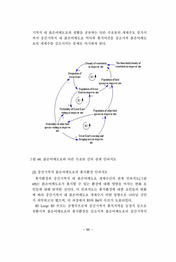 86 기착지 내 붉은어깨도요와 생활을 공유하는 다른 수조류의 개체수도 증가시 켜서 중간기착지 내 붉은어깨도요 먹이와 휴식여건을 감소시켜 붉은어깨도 요의 개체수를 감소시키는 문제도 야기하게 된다. 그림 68. 붉은어깨도요와 다른 수조류 간의 관계 인과지도 2 중간기착지 붉은어깨도요의 휴식환경 인과지도 휴식환경과 중간기착지 내 붉은어깨도요 개체수간의 관계 인과지도 그림 69 는 붉은어깨도요가 휴식할 수 있는 환경에 대해 영향을 미치는 변화 요 인들에 대해 탐색한 것이다. 이 인과지도는 휴식환경에 대한 요인들의 변화 에 따라 중간기착지 내 붉은어깨도요 개체수가 어떤 방향으로 나타날 것인 지 파악하고자 했으며, 이 과정에서 B3와 B4의 루프가 도출되었다. B3 LoopB3 루프는 균형루프로써 중간기착지 휴식지역을...