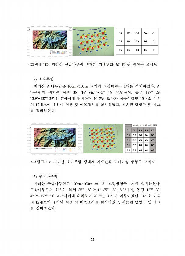 72 그림Ⅲ-10 지리산 신갈나무림 생태계 기후변화 모니터링 방형구 모식도 2 소나무림 지리산 소나무림은 100m×100m 크기의 고정방형구 1개를 설치하였다. 소 나무림의 위치는 북위 35° 1666.435° 1666.9사이, 동경 127° 2913.9127° 2914.2사이에 위치하며 2017년 조사가 이루어졌던 13개소 이외 의 12개소에 대하여 식생 및 매목조사를 실시하였고, 훼손된 방형구 및 태그 를 정비하였다. 그림Ⅲ-11 지리산 소나무림 생태계 기후변화 모니터링 방형구 모식도 3 구상나무림 지리산 구상나무림은 100m×100m 크기의 고정방형구 1개를 설치하였다. 구상나무림의 위치는 북위 35° 1824.135° 1818.8사이, 동경 127° 3347.2127° 3354.6사이에 위치하며 20...