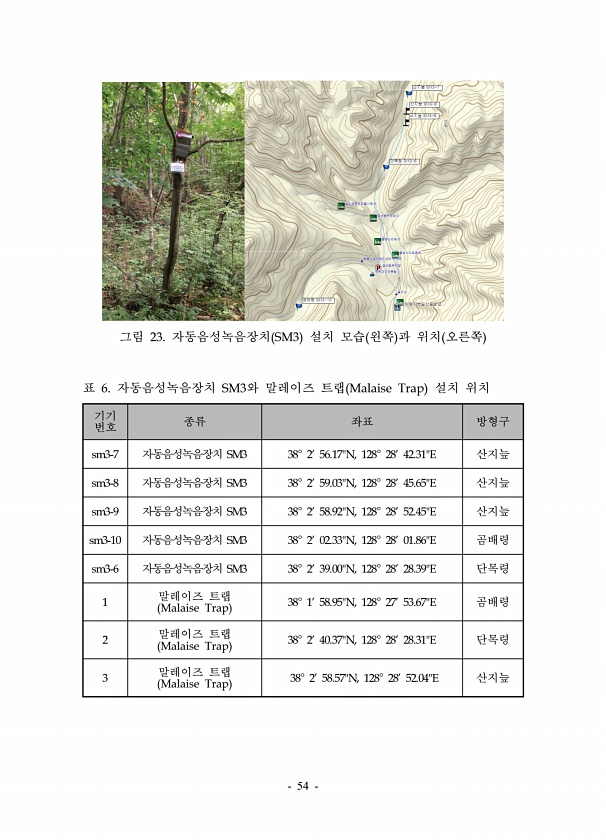 54 그림 23. 자동음성녹음장치 SM3 설치 모습 왼쪽 과 위치 오른쪽 기기 번호 종류 좌표 방형구 sm3-7 자동음성녹음장치 SM3 38° 256.17N, 128° 2842.31E 산지늪 sm3-8 자동음성녹음장치 SM3 38° 259.03N, 128° 2845.65E 산지늪 sm3-9 자동음성녹음장치 SM3 38° 258.92N, 128° 2852.45E 산지늪 sm3-10 자동음성녹음장치 SM3 38° 202.33N, 128° 2801.86E 곰배령 sm3-6 자동음성녹음장치 SM3 38° 239.00N, 128° 2828.39E 단목령 1 말레이즈 트랩 Malaise Trap 38° 158.95N, 128° 2753.67E 곰배령 2 말레이즈 트랩 Malaise Trap 38° 240.37N, 12...