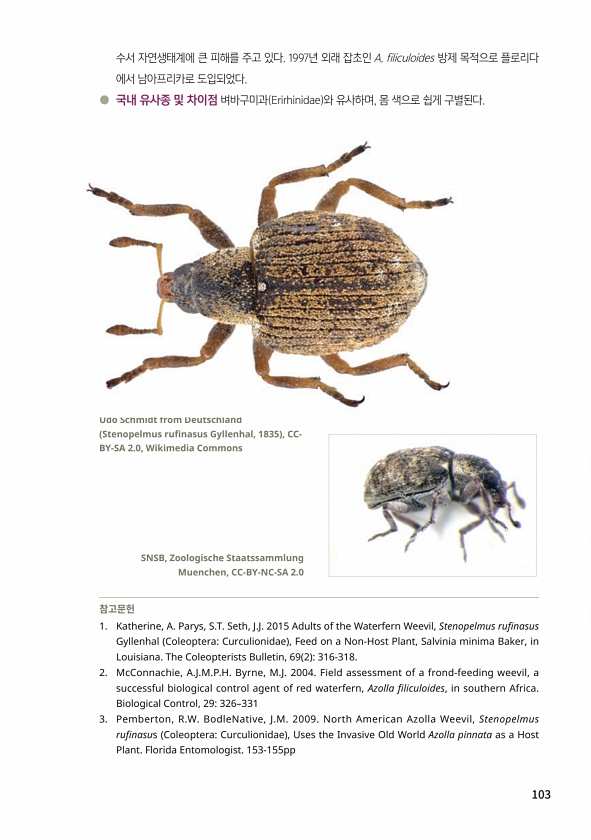 103 수서 자연생태계에 큰 피해를 주고 있다. 1997년 외래 잡초인 A. filiculoides 방제 목적으로 플로리다 에서 남아프리카로 도입되었다. ● 국내 유사종 및 차이점 벼바구미과 Erirhinidae 와 유사하며, 몸 색으로 쉽게 구별된다. 참고문헌 1. Katherine, A. Parys, S.T. Seth, J.J. 2015 Adults of the Waterfern Weevil, Stenopelmus rufinasus Gyllenhal ColeopteraCurculionidae , Feed on a Non-Host Plant, Salvinia minima Baker, in Louisiana. The Coleopterists Bulletin, 69 2 316-318. 2. McConnachi...