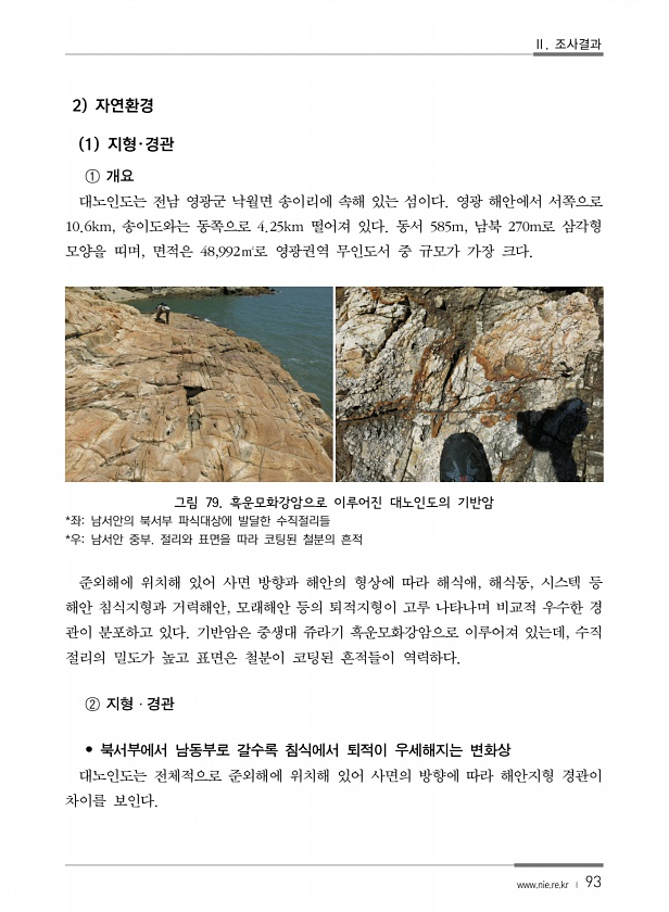 Ⅱ. 조사결과 www.nie.re.kr ? 93 2 자연환경 1 지형?경관 ① 개요 대노인도는 전남 영광군 낙월면 송이리에 속해 있는 섬이다. 영광 해안에서 서쪽으로 10.6km, 송이도와는 동쪽으로 4.25km 떨어져 있다. 동서 585m, 남북 270m로 삼각형 모양을 띠며, 면적은 48,992㎡로 영광권역 무인도서 중 규모가 가장 크다. 그림 79. 흑운모화강암으로 이루어진 대노인도의 기반암 *좌남서안의 북서부 파식대상에 발달한 수직절리들 *우남서안 중부. 절리와 표면을 따라 코팅된 철분의 흔적 준외해에 위치해 있어 사면 방향과 해안의 형상에 따라 해식애, 해식동, 시스텍 등 해안 침식지형과 거력해안, 모래해안 등의 퇴적지형이 고루 나타나며 비교적 우수한 경 관이 분포하고 있다. 기반암은 중생대 쥬라기...