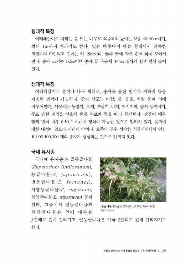 수입과 반입에 심사가 필요한 환경부 지정 위해우려종 Ⅱ 103 형태적 특징 여러해살이로 자라는 풀 또는 나무로 식물체의 높이는 보통 40-60㎝이며, 최대 1m까지 자라기도 한다. 잎은 마주나며 바늘 형태에서 길쭉한 원형까지 확인되고 길이는 약 15㎝이다. 꽃대 끝에 작은 흰색 꽃이 모여서 핀다. 종자 크기는 1-2㎜이며 종자 끝 부분에 3-4㎜ 길이의 흰색 털이 붙어 있다. 생태적 특징 여러해살이로 풀이나 나무 형태로, 종자를 통한 번식과 지하경 등을 이용한 번식이 가능하다. 종자 산포는 바람, 물, 동물, 차량 등에 의해 이루어진다. 서식처는 농경지, 초지, 조림지, 나지, 도시지역, 습지 등지이며, 주로 습한 지역을 선호해 종종 수로변 등을 따라 확산된다. 생장이 매우 빨라 발아 이후 8-10주 이내에...